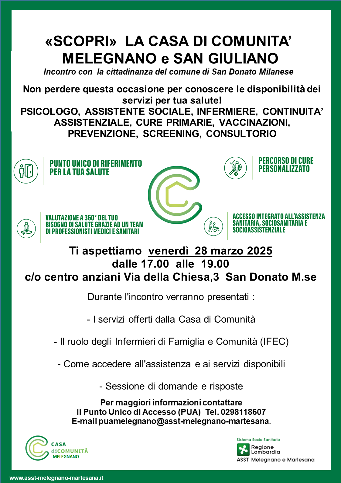 Ciclo di incontri di presentazione Casa di Comunità di Melegnano e San Giuliano: da Marzo a Ottobre 2025 | da marzo a Ottobre | Vizzolo P, San Donato Milanese, San Zenone al Lambro, Dresano, Colturano, San Giuliano Milanese, Melegnano, Carpiano | |