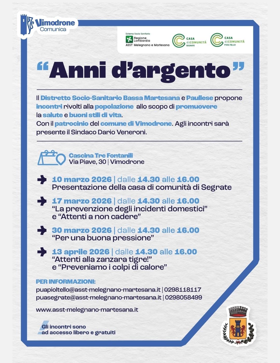 Con il patrocinio del comune di Vimodrone. Agli incontri sarà presente il Sindaco Dario Veneroni.