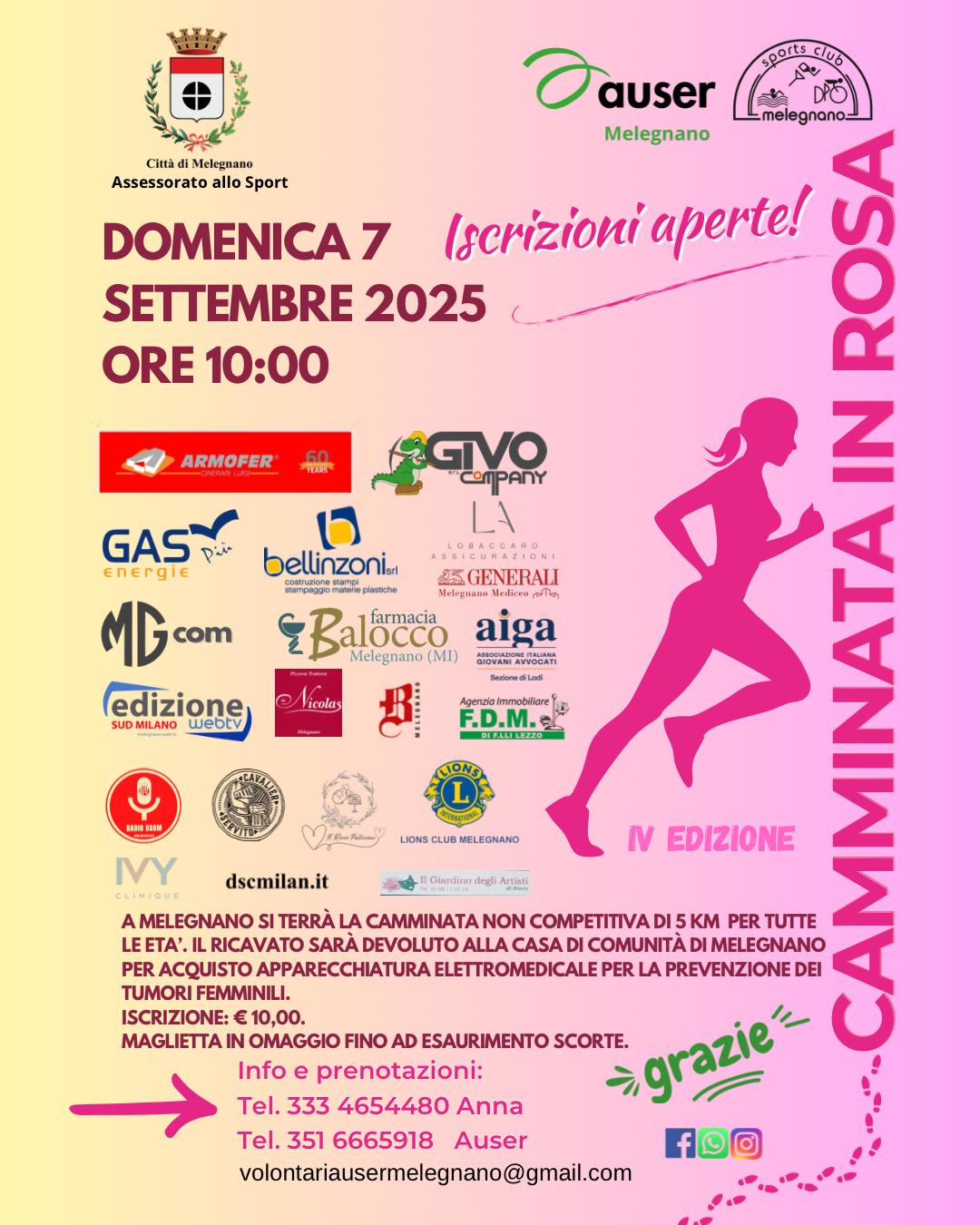 Partecipa alla IV Edizione della Camminata in Rosa a Melegnano! 📅 Domenica 7 Settembre 2025 – Ore 10:00 📍 Melegnano