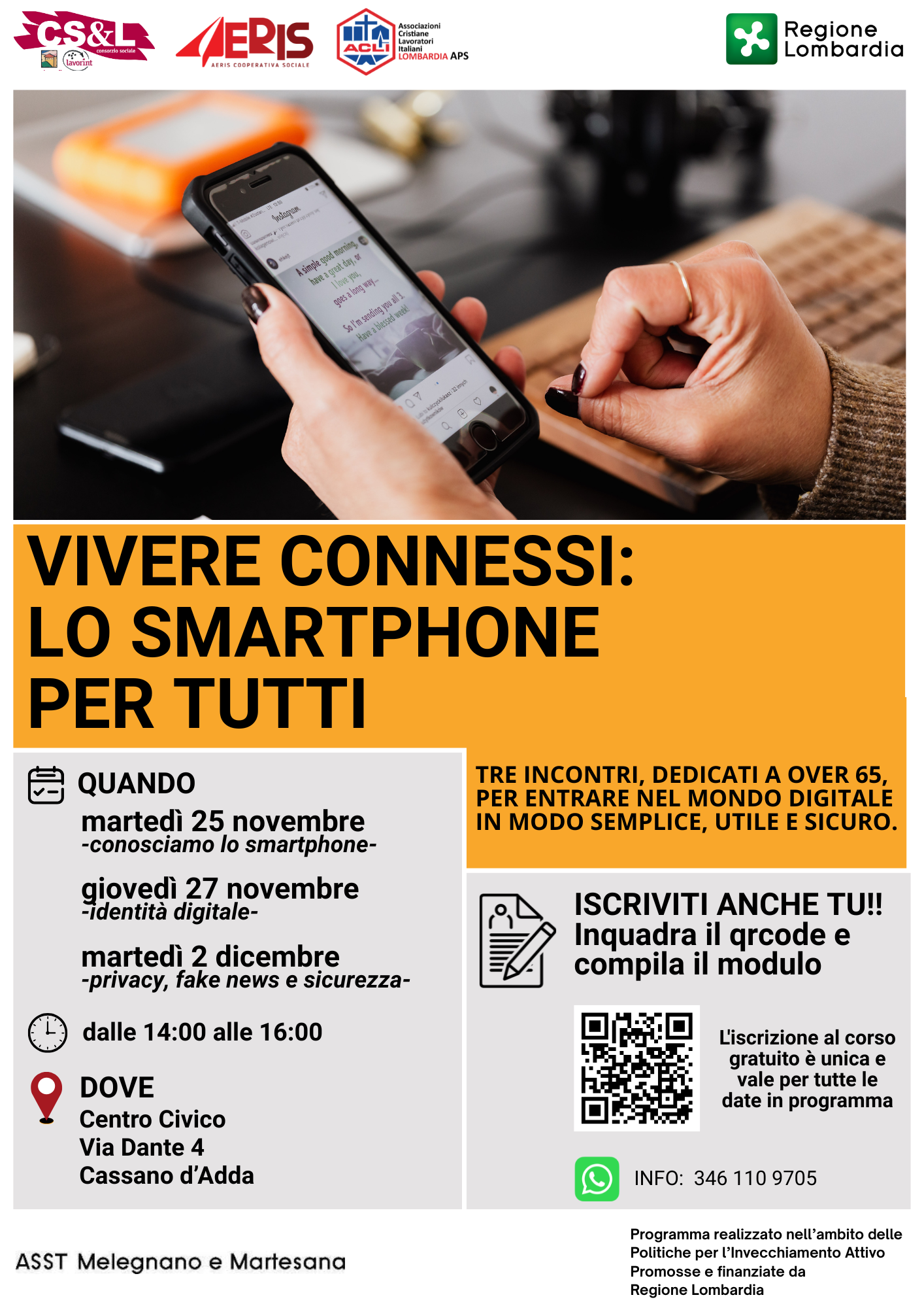 Vivere connessi: lo smartphone per tutti è un evento formativo che si articola in tre Incontri gratuiti dedicati alle persone di età superiore a 65 anni per facilitare l'ingresso nel mondo digitale in modo semplice, utile e sicuro.